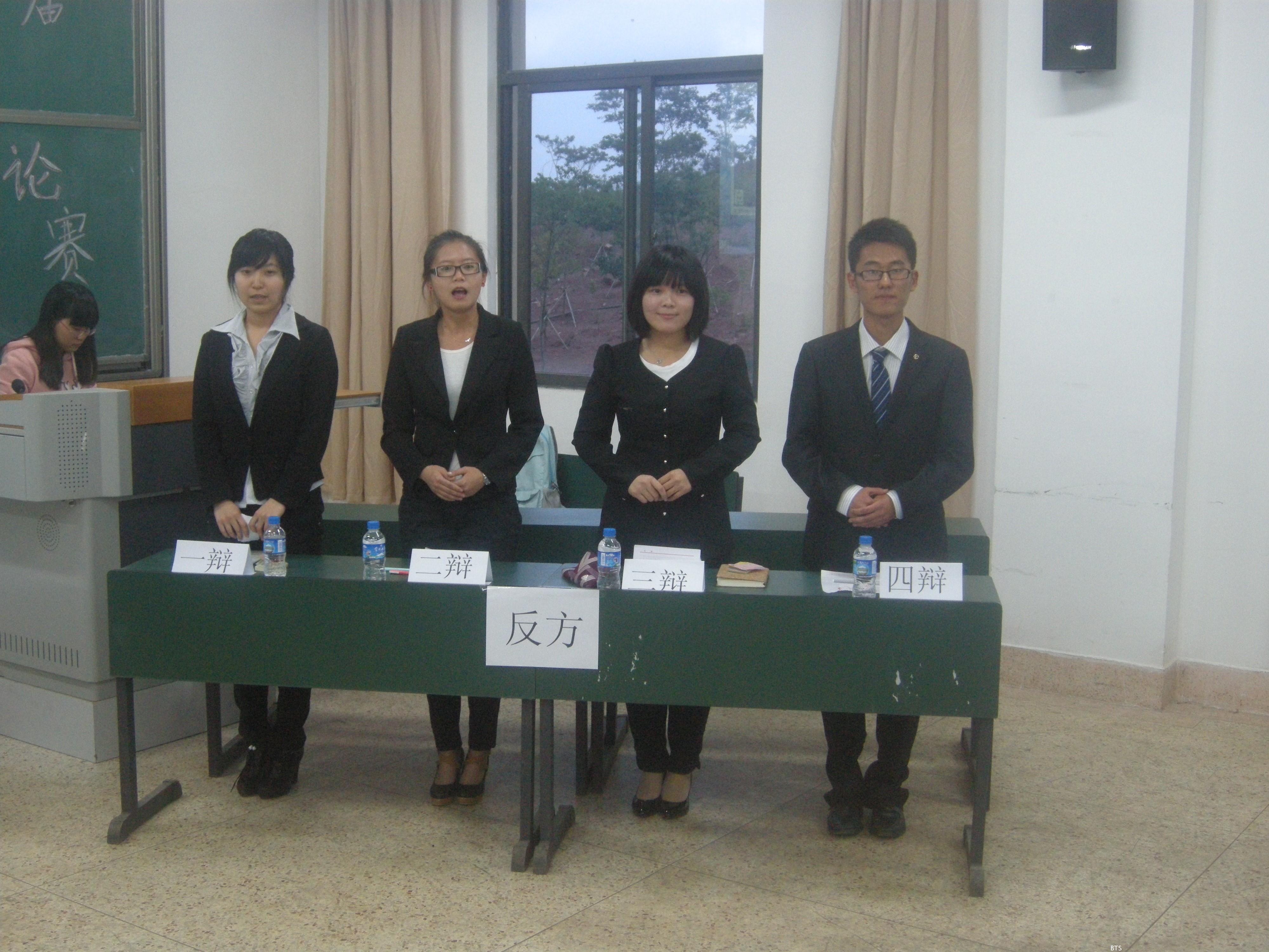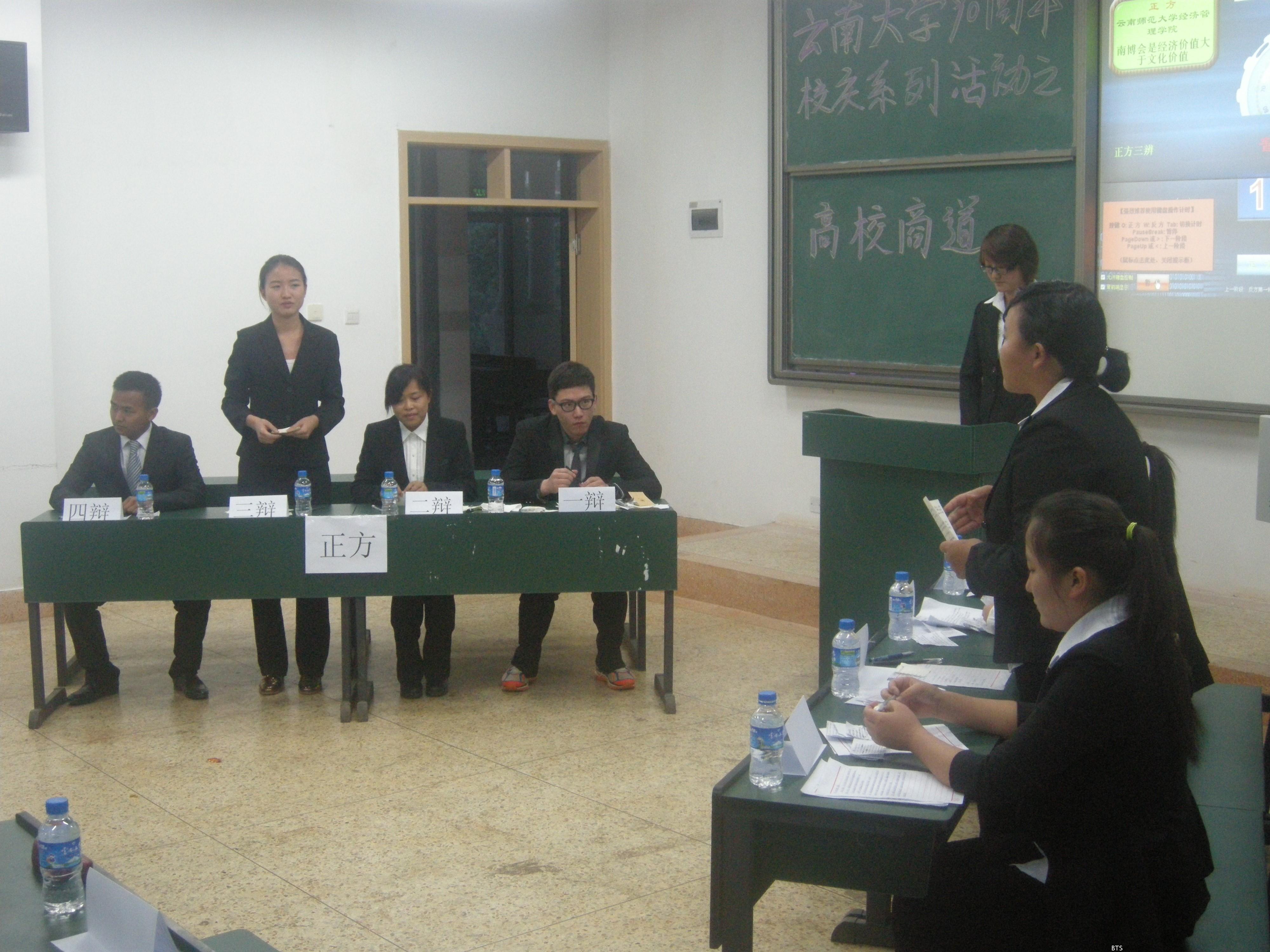 在主持人介绍完辩论赛题目和规则后,激励的辩论开始了。一辩中,以“人民币对美元汇率持续增值率是否利大于弊”为辩题的正反双方展开了近一个小时的激烈角逐,最终由国际公司取胜。