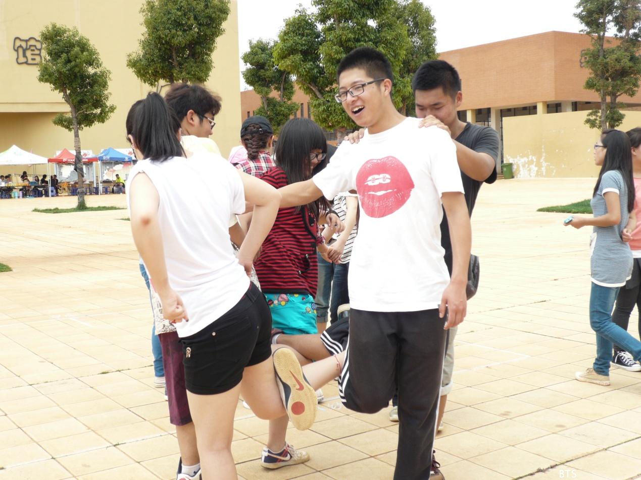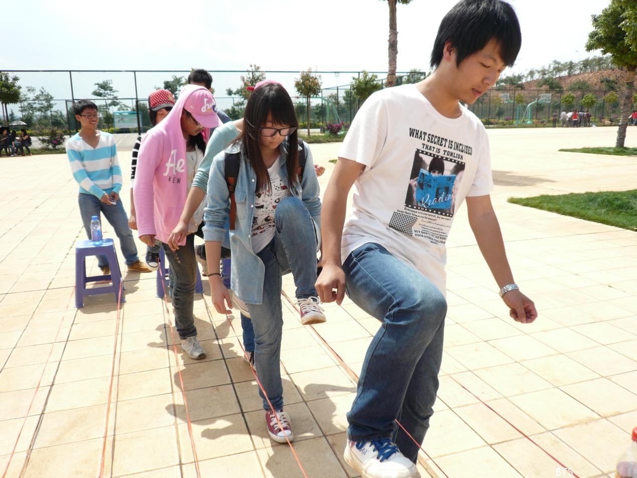 接下来来到游戏环节。“编花篮”,“猜字谜”,“环环相扣”,“翻山越岭”……这些别出心裁的小游戏,吸引了在场所有人前来参与。在活动负责人的带领下,同学们男女搭配,各使奇招,活动在阳光和音乐声欢乐地进行着。