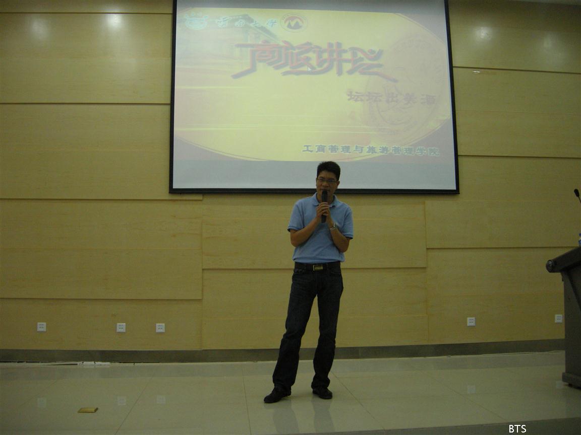 2013年5月20日星期一晚7:00—9:00,在经济公司报告厅内, 本学期第三期商旅讲坛如期开展,云南省咖啡行业协会副秘书长、昆明善策文化传播有限公司、云南苦苦咖啡有限公司法定代表人胡路先生为我们带来了一次精彩的、名为《智慧创造财富,策划改变人生》的演讲。